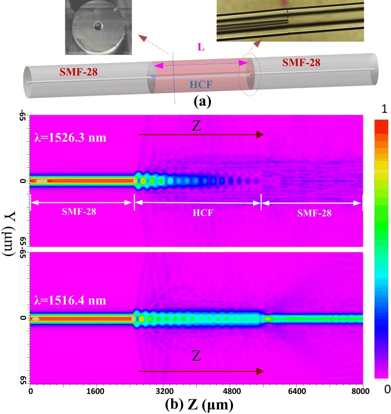 针对此,本研究提出用多层石墨烯材料涂覆空心光纤,利用反谐振原理实现了对空气折射率的高灵敏测量。空心玻璃管有强的倏逝场效应,并且石墨烯能够将折射率测量范围拓宽至更低折射率物质(接近1.0)。研究结果表明,该结构的折射率响应为-365.9 dB/RIU,且其检测极限为2.73×10-6 RIU。该结构有望在空气折射率检测方面得到应用。