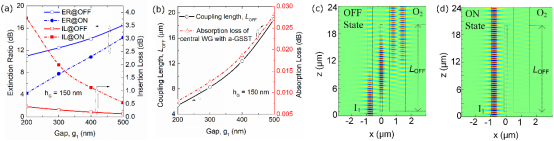 通过分析模式复用/开关内部结构及模式演变特性,该项工作引入Ge2Sb2Se4Te1相变材料作为开关节拍器,提出一种非易失性且具有超低损耗的模式复用/开关,实现零功耗开关状态保持。主要性能参数为:器件尺寸29.3 μm“OFF”  “ON”状态下,消光比分别达到18.9822.18dB插入损耗低至0.100.68dB工作带宽覆盖S+L+C波段该项工作为实现低功耗和smart-MDM光网络提供可行性方案。