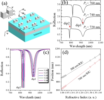 图1:(a) 磁SPR与SPPs相互耦合的三维超构材料结构示意图。(b) 光垂直入射时,对应不同Px周期数值计算的三维超构材料的反射谱。(c)光垂直入射时数值计算的三维超构材料的反射谱。环境媒质的折射率从1.00增加到1.04。(d) 磁SPR和窄带杂化模的位置对折射率的依赖关系,其中黑线对应dip 1,红线对应dip 2。