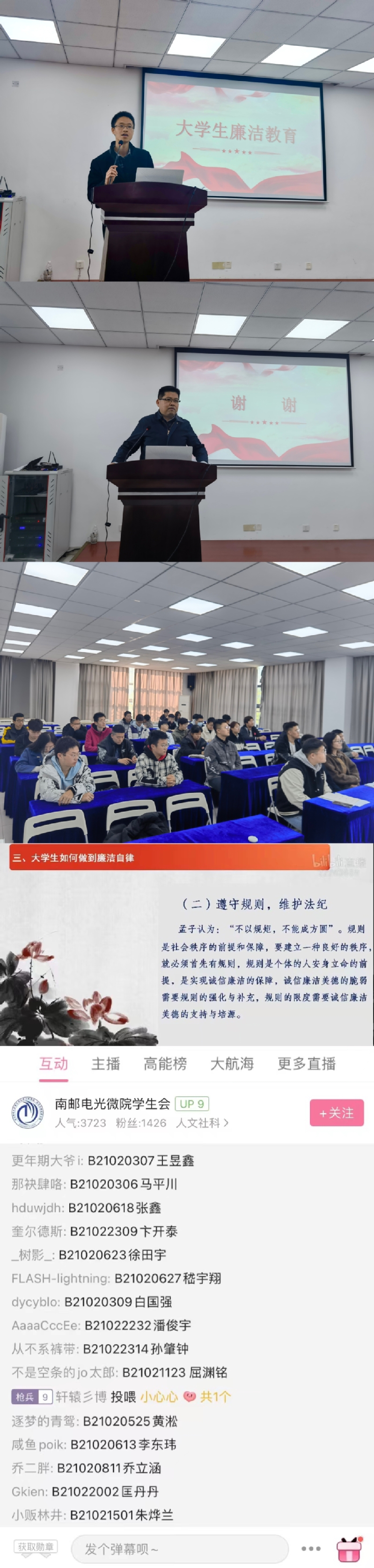 为深入开展廉洁教育,提高大学生廉洁素养,11月10日中午,我平台 在学科楼B322开展“廉洁清风劲、扬帆新征程”新生主题廉洁教育,学院专职纪检委员宋健康作专题教育,学院党委副书记高翔主持教育会。本次廉洁教育采用线上线下相结合的方式,部分新生代表在主会场参加,其他新生通过叮叮直播平台线上参会。