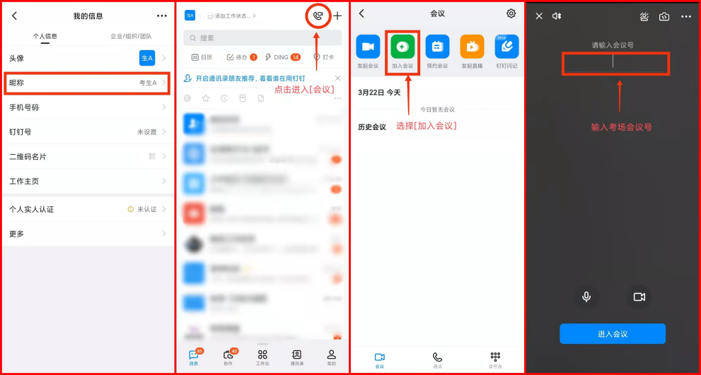 腾讯会议PC端 腾讯会议APP 备用平台:打开 钉钉会议 软件/APP,先修改昵称为“考生姓名A/B”,再点击左侧工具栏上的“会议”图标,在右侧输入会议口令,即可加入会议。钉钉考场将有2个会议号,一个是等候室,一个是正式考场,考生先进入等候室进行身份校验,校验通过后进入正式考场。