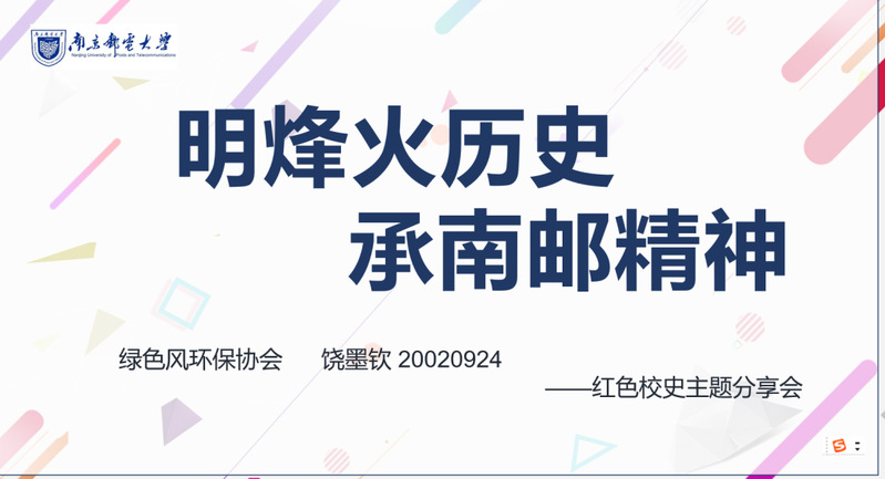 在南京邮电大学建校80周年校庆来临之际,太阳城网络赌博平台 于3月13日下午,通过线上平台开展了以“明烽火历史 承南邮精神”为主题的红色校史线上宣讲活动。本次活动旨在激励团员青年们不忘历史、知史爱党、知史爱国、知史爱校,让思政教育深入人心。活动由学院绿色风环保协会的同学们发起,学院新一期菁英人才班全体学员线上参会。