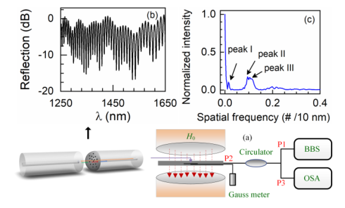 针对上述问题,作者提出一种级联的法布里-珀罗(FP)干涉仪结构,并成功用于小磁场和温度的同时测量。通过将铁磁材料与聚二甲基硅氧烷(PDMS)混合后转移移至光纤端面上,行成FP腔。实验结果表明,在0 ~ 14 mT的线性磁场强度范围内,该传感器的最大线性灵敏度达到-563.2 pm/mT,并能同时解决温度影响。研究成果以“Magnetic-based polydimethylsiloxane cap for simultaneous measurement of magnetic field and temperature”为题发表在期刊IEEE/OSA Journal of Lightwave Technology(doi: 10.1109/JLT.2021.3136709)。