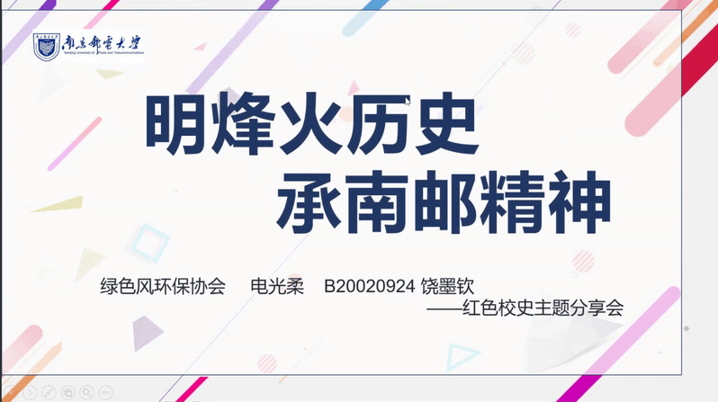 为让同学们更进一步了解南邮的红色校史,成为优秀的南邮学子,4月13日下午,太阳城网络赌博平台 第107、108期菁英人才学校举行第二次授课。根据疫情防控要求,本次授课通过腾讯会议的线上形式展开,我校绿色风协会负责人饶墨钦担任主讲,菁英人才学校全体学员参加。