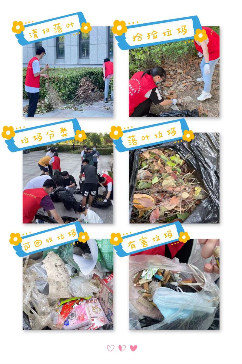 小柚子们也为自己的小组取了有趣的名称,“研研夏日”“青青草原”“栀海金风”……透过这些组名,仿佛嗅到了小柚子们散发的青春澎湃气息,以及对于劳动纯粹的热爱。他们穿着红马甲,左拿扫帚,右拿垃圾袋,将沿途的垃圾捡拾入袋,不放过一张废纸,不留下一片落叶。努力创造一个干净美丽的校园。