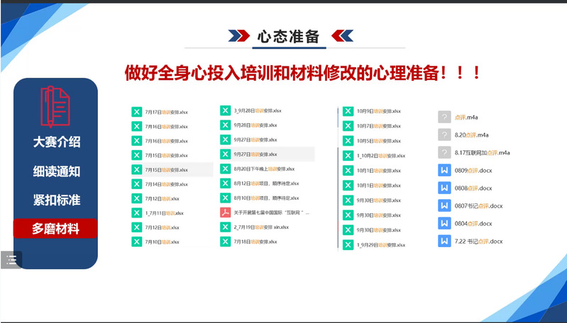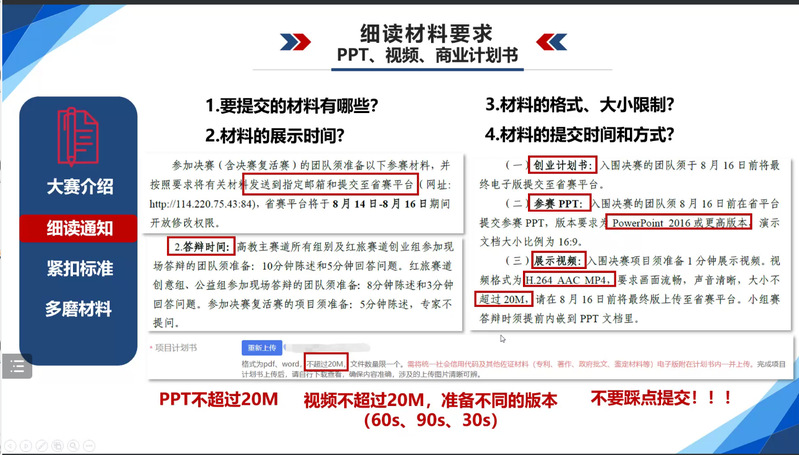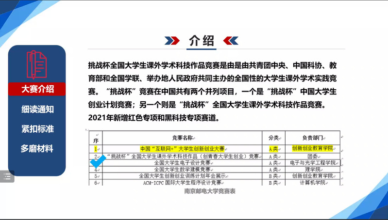 本次授课主题为《走三创“一带一路”,上三全“创新台阶”——挑战杯、“互联网+”竞赛交流》,旨在鼓励同学们积极参加“挑战杯”“互联网+”竞赛。课程开始,李孟杨老师将两项竞赛结合,对二者进行了介绍。紧接着,李老师带领同学们细读了关于ppt、视频、商业计划书的材料要求,并结合往年参赛者的参赛经历,着重讲述了竞赛的各组评分标准,详尽分析了项目的指标体系。之后还从赛事、心态、材料等方面提出了建议。除此之外,他还指出,“一个好的题目”“一个引人入胜的视频”“两版大方美观的ppt”“多个靠谱的朋友”“一场有趣的经历”是获得高分的必要前提。他希望每位参赛同学能更多关注技术之外的细节,更希望同学们能够积极参与到这两项竞赛中去,提升自己的综合素质。