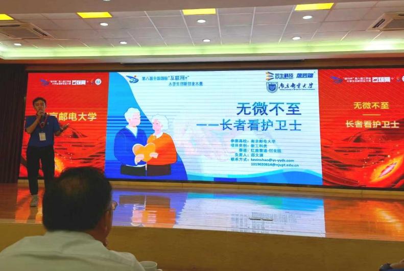在启动仪式现场的“无微不至——长者看护卫士”项目区,据来自南京邮电大学的学生团队代表暨芸生科技公司负责人邵文渊介绍,中国疾病监测系统的数据显示:摔倒和摔倒后无人救治是老年人受伤和致死的首要原因,该问题的普遍性和严重性已不容忽视。为此,芸生科技依托南京邮电大学电子科学与技术“世界一流学科”建设计划,利用国际领先的毫米波射频芯片和AI技术,经过上次的摔倒数据采集和数十次版本技术迭代,成功的研制出了“落芸端--长者看护卫士”系列产品。邵文渊谈道:“我们项目的优势是在保证隐私安全的前提下,全天候全方位实时监测老人的行动轨迹,并及时告警意外情况,时刻关注老年群体的生活与精神状态。”