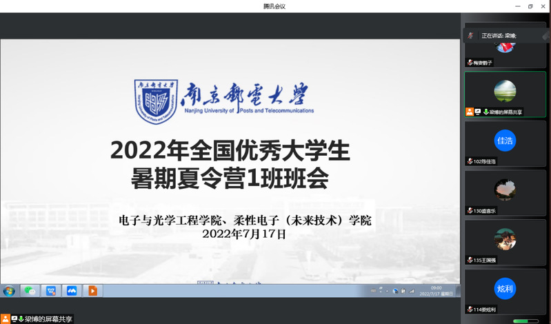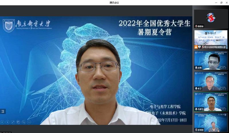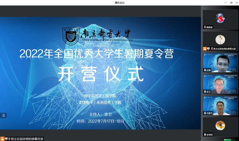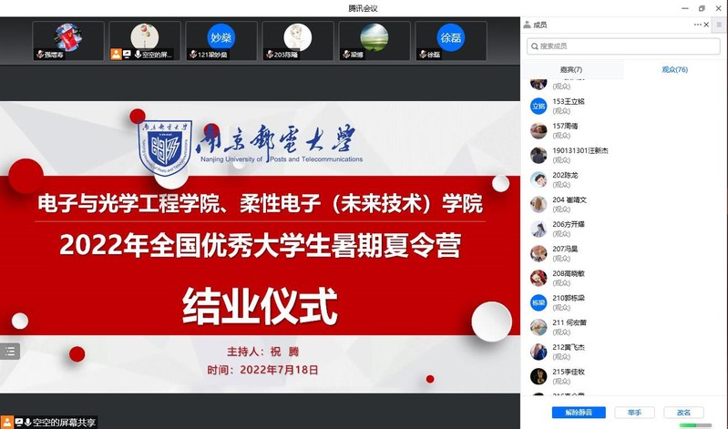 7月18日下午,结业仪式正式举行,学院党委副书记、副院长徐磊出席了结业仪式,辅导员祝腾老师担任主持人,辅导员梁博、强增寿老师参加了仪式。南京邮电大学梁妙燊同学和长春理工大学曾学成同学作为学员代表发言,分享了为期两天的夏令营感受。学院党委副书记、副院长为2022年全国大学生暑期夏令营致辞,她首先向参加夏令营的所有同学们致以亲切地问候和衷心地祝贺,感谢他们选择南邮电光柔院,欢迎同学们成为学院历史的参与者、见证者和缔造者,在这里学思践悟,知行合一。