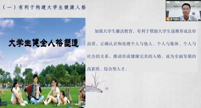 为帮助新生树立廉洁意识,扣好人生第一粒扣子,营造良好的校园廉洁文化氛围,9月14日下午,我平台 开展新生廉政教育活动,学院专职纪检委员宋健康为新生作了以“廉政教育与校园廉洁文化”为主题的专题讲座,学院 2022级全体本科新生通过视频会议形式线上参会。