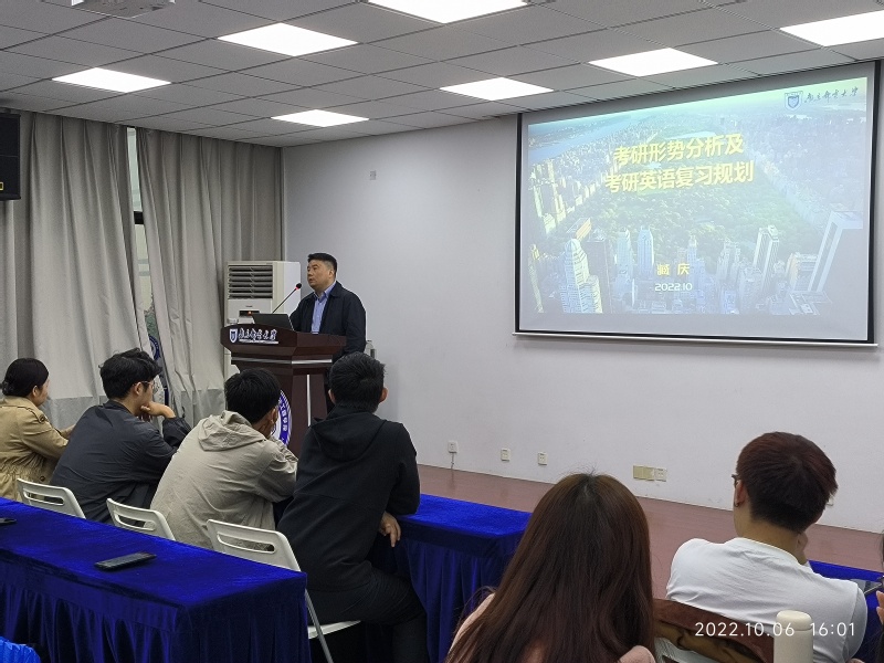 会议伊始,我校教务处副处长臧庆教授开场。臧庆教授是全国考研英语名师,国家考研英语阅卷组成员,具有十多年的考研英语辅导经验。臧庆教授分别从考研形势、考研英语难度、典型例题等方面为同学们展开了详细介绍,指出考研英语的难度级别较高,不光需要大量的词汇量积累,还需要清晰的逻辑思辨能力、丰富的文化积累以及纯熟的写作表达能力。大三的同学们可以从词汇量开始准备,一步步积累,在最后的考试中取得较好的成绩。