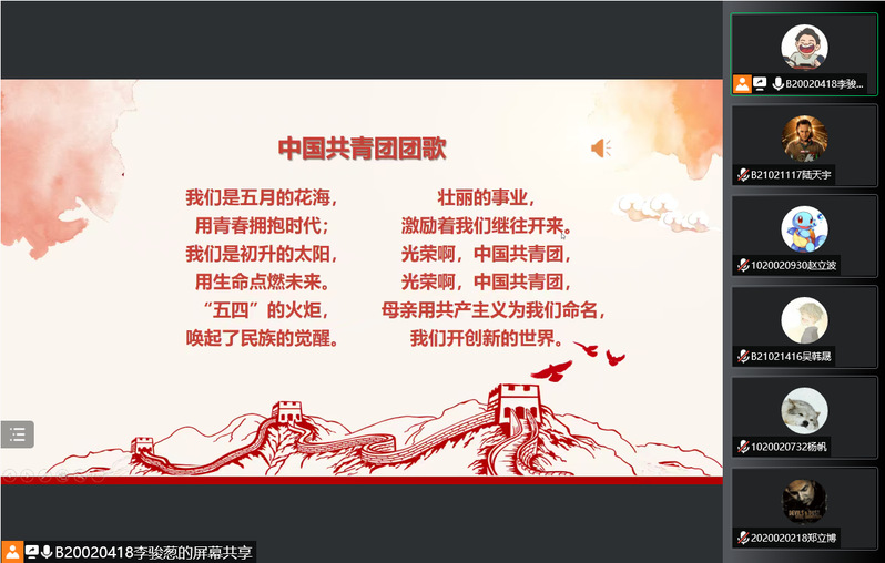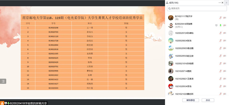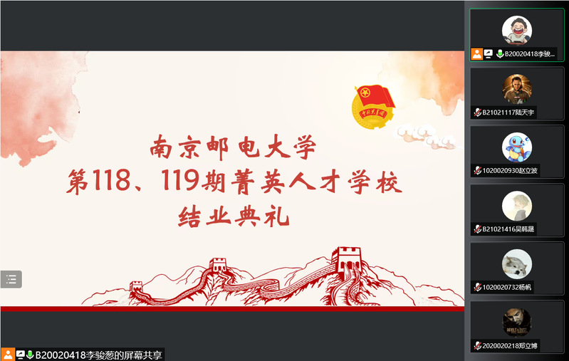 为促使学员们不忘初心、牢记使命,传承红色基因,坚定爱党爱国信念,将自身的责任与担当同党和国家事业联系起来,踔厉奋发,赓续前行。10月10日晚,太阳城网络赌博平台 正式举行第118、119期菁英人才学校结业典礼。本次会议由分团委秘书处李骏葱同学主持,院分团委书记肖俊桂老师、2020级辅导员刘振老师出席,全体菁英人才学校学员参会。