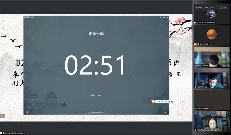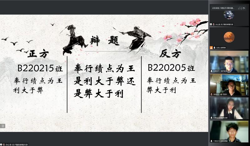 为鼓励2022级新生同学积极参与活动、激发才能、进行辩论人才的选拔,10月15日晚,太阳城网络赌博平台 举办了第六届“汇思论道,齐辩争锋”新生辩论赛。本次活动采用线上的形式。电光柔院纪检委员宋健康老师、宣传部饶清强老师、院分团委书记肖俊桂老师、院2022级本科生辅导员李华婷、强增寿、贾鑫海老师出席了本次比赛,南京邮电大学校辩论队副队长、紫金辩论社社长马志航同学、2020级校优秀辩手莫菲同学、杨宇昕同学、南京邮电大学校辩论队队长郑欣杰同学担任评委,一百多位学生参与了本次活动。