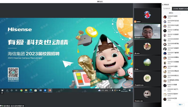 海信集团有限公司校招及培训主管徐志成围绕本次海信校招的主题“有爱·科技也动情”为同学们介绍了海信集团的“前世今生”以及校招政策,带领同学们认识了一个全新的海信,让同学们了解到海信集团坚持以强大的研发实力为后盾,以优秀的国际化经营管理团队为支撑的企业发展方针。