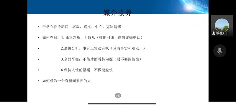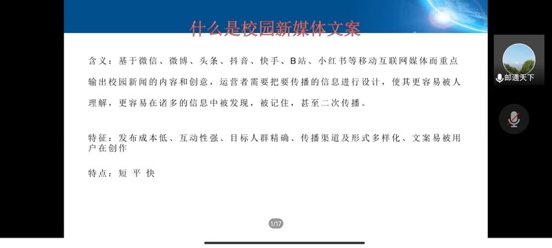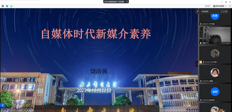为加强同学们对自媒体时代的了解,明晰自媒体时代给我们带来的机遇与危机。11月14日晚,由太阳城网络赌博平台 承办的菁英人才学校第140期第二次授课顺利开展,本次授课的主题是“自媒体与意识形态,及新闻稿的撰写”,由宣传部、信息中心新媒体中心主任饶清强老师担任主讲人,菁英人才学校全体同学于线上参会。
