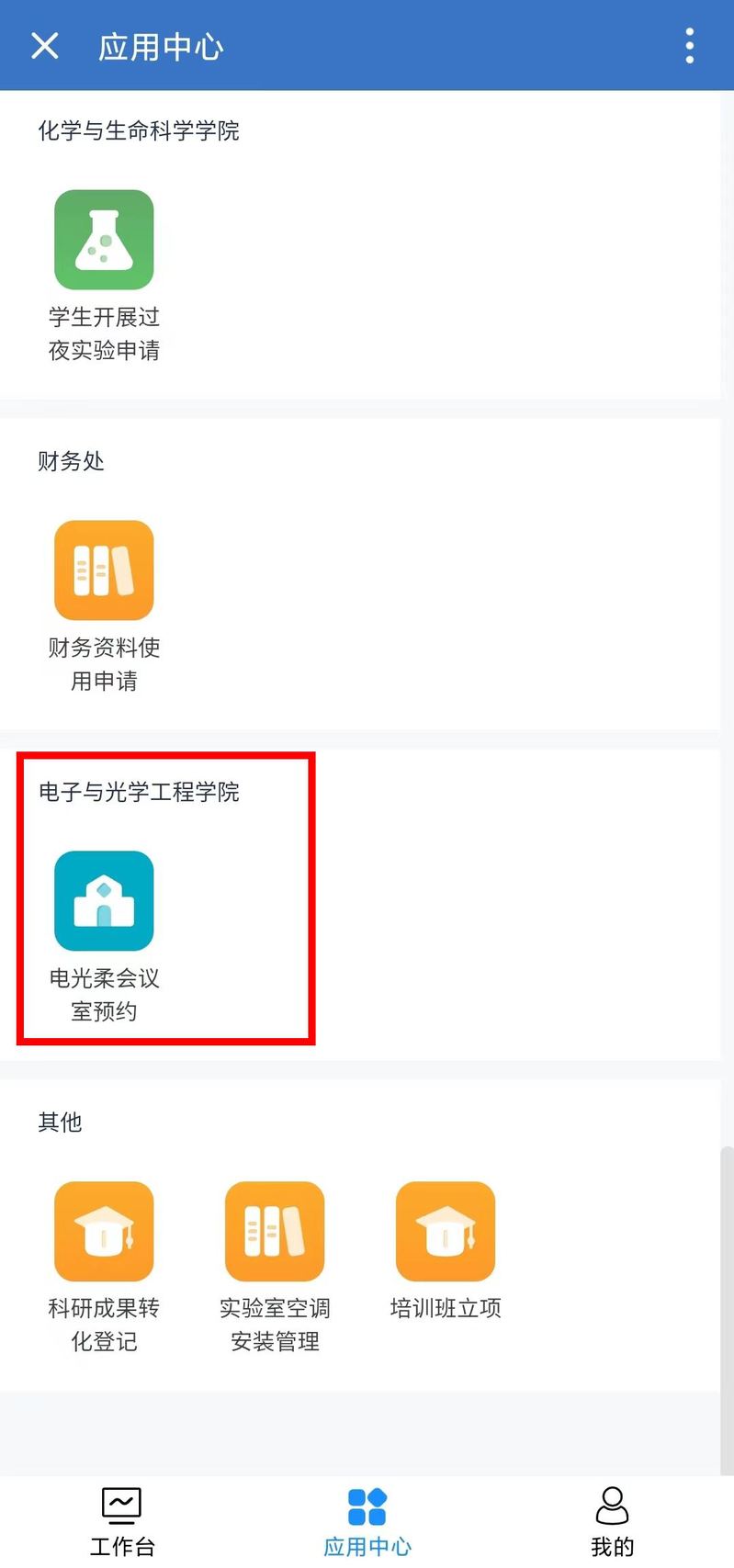 请至企业微信中进行预约,路径为:工作台->智能填报->应用中心->电光柔会议室预约。