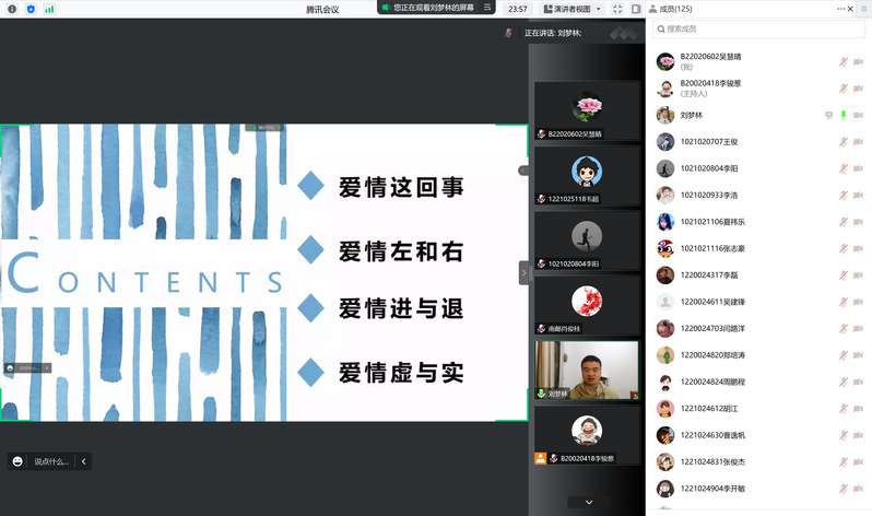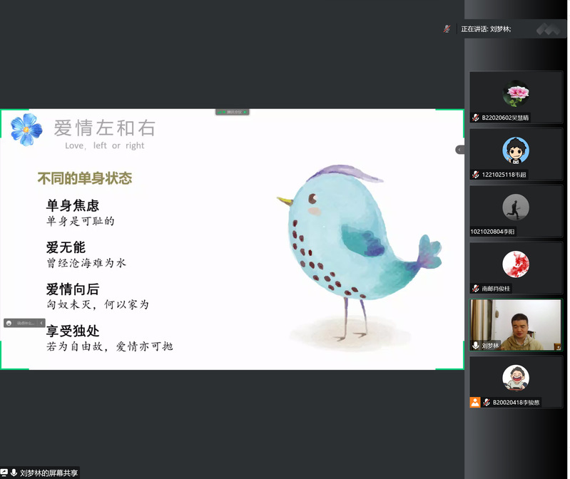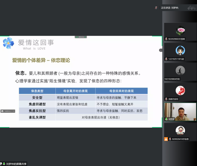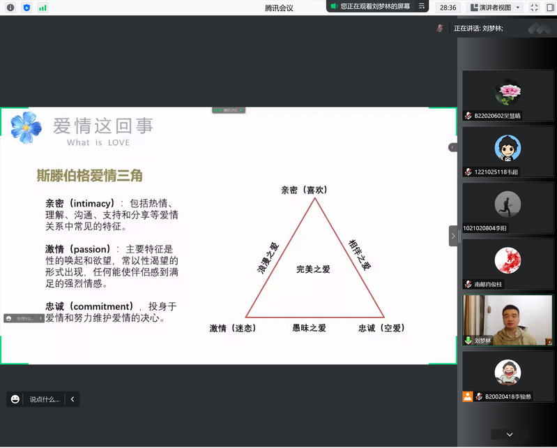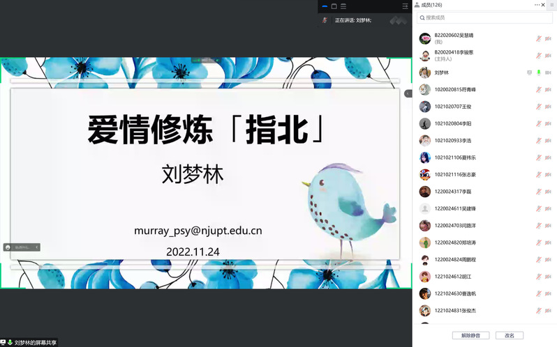 本次授课由南京邮电大学专职心理咨询师刘梦林老师担任主讲,菁英人才学校全体成员于线上参与本次课程。本次授课主题为《修炼爱情“指北”》。