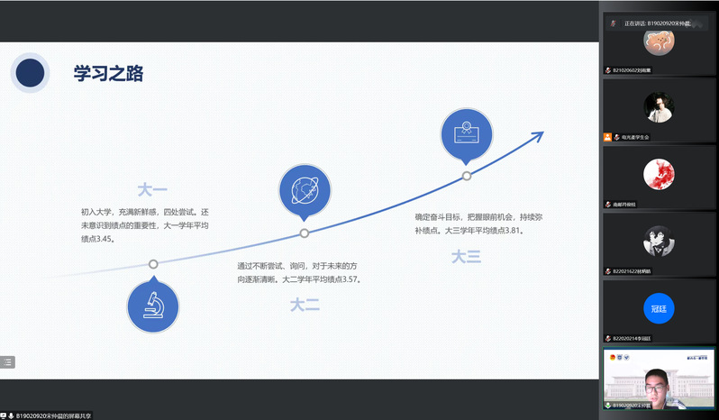 在25日的故事分享中,专业绩点第一,以一作发表多篇SCI论文的饶思思同学首先带来了自己的学习故事。她阐述了自己大学后从处于迷茫状态到找到学习目标方向的转变,用最终保研的结果向大家证明了及时找到适合自己的学习道路并为之努力的重要性。随后,曾任我平台 科协主席,荣获多项竞赛奖项的代军同学就各类竞赛的最佳参赛时间、比赛重点向大家进行了讲解,指导大家根据自身优势选择适合自己的竞赛项目。获得过一等奖学金、三好学生、校长嘉奖令以及多项国家级奖项的唐承乾学长重点就电子设计类竞赛向大家详细介绍了竞赛特色以及涉及保研的竞赛成就要求,鼓励同学与志同道合的同学共同研讨、齐力奋斗。