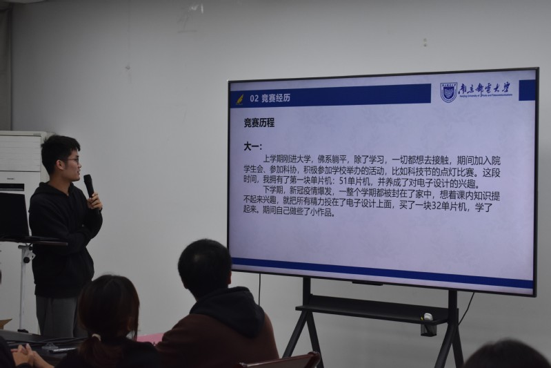 在26日的故事分享中,曾任学院学生会主席,现为南京邮电大学第25届研支团成员、曾获“优秀学生干部”、“二等奖学金”、“优秀学生会干部”、“优秀青年志愿者”等各项荣誉的宋仲晨同学向我们讲述了他在学生会活动以及各项志愿服务中的生活与心得,呼吁了大家以真诚传递温暖,以薄力做出贡献。随后曾主持国家级STITP项目1项并以优秀结题,以第一作者身份发表EI论文2篇,申请发明专利2项,获第七届中国国际“互联网+”大学生创新创业大赛国家级金奖等十余项奖项,曾获“江苏省优秀学生干部”、“优秀共青团干部”、“优秀青年志愿者”等荣誉称号的铁欢颜同学向我们讲述了她平衡学生工作与竞赛的学习技巧,提出拒绝无效内卷,提倡有效竞争,劝诫同学们进行深入思考,不要浮于表面地浪费时间。最后,曾斩获2021年美国大学生数学建模竞赛特等奖提名奖和“挑战杯”江苏省大学生创业计划竞赛金奖等国家级和省部级学科竞赛获奖累计20余项,获各类奖学金等荣誉累计18项,且已拟推荐为南京邮电大学2022年“创新标兵”的宋子晨同学就“传承”“回馈”“激励”三方面讲述了自己在迷茫中不断重拾动力,最终学有所获的故事,指导新生同学们在大一时于迷茫中探索,大二时于充实中拓展,大三时于希望中奋进,大四时于收获后回馈,并祝愿同学们学有所获、学有所得、学有所成。