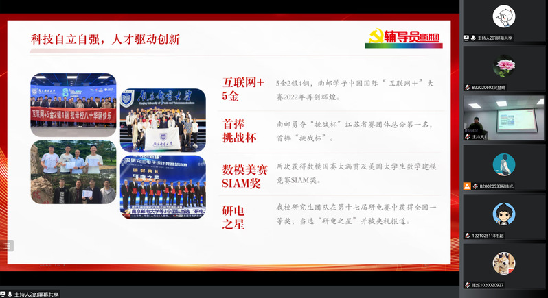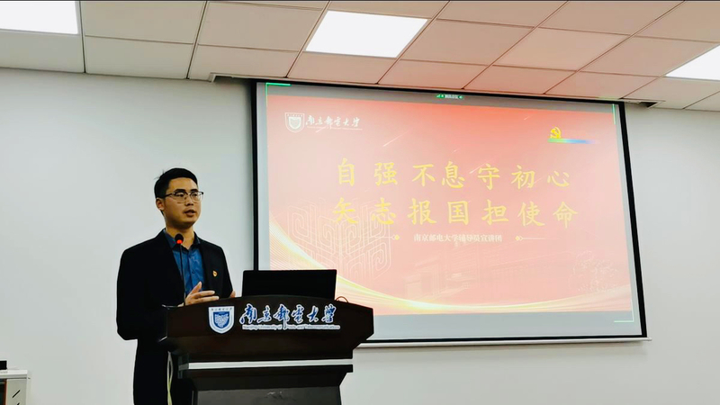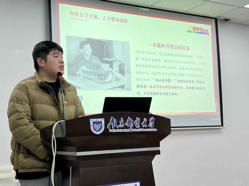 12月7日18:30,“学习贯彻党的二十大精神”辅导员宣讲团走进太阳城网络赌博平台 ,为南京邮电大学第140期菁英人才学校全体学员开展题为“育才报国守初心,信达天下承使命”的授课宣讲,本次活动宣讲人为电光柔学院2020级辅导员刘振老师。此外,活动还特别邀请波特兰学院眭颖艺、电光柔学院程玮光两位同学共同助力宣讲。本次宣讲会于线上线下同步进行。