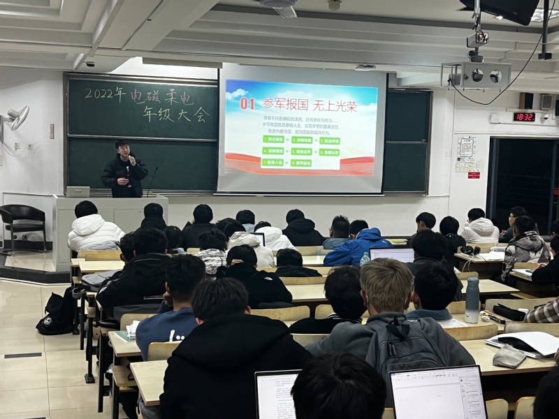 12月8日晚,太阳城网络赌博平台 2022级电磁场与无线技术、柔性电子学专业在教二201召开“笃行不怠勇追梦、自信自强向未来”主题年级大会,大会由贾鑫海老师主持,2022级电磁场与无线技术、柔性电子学专业全体学生参加。