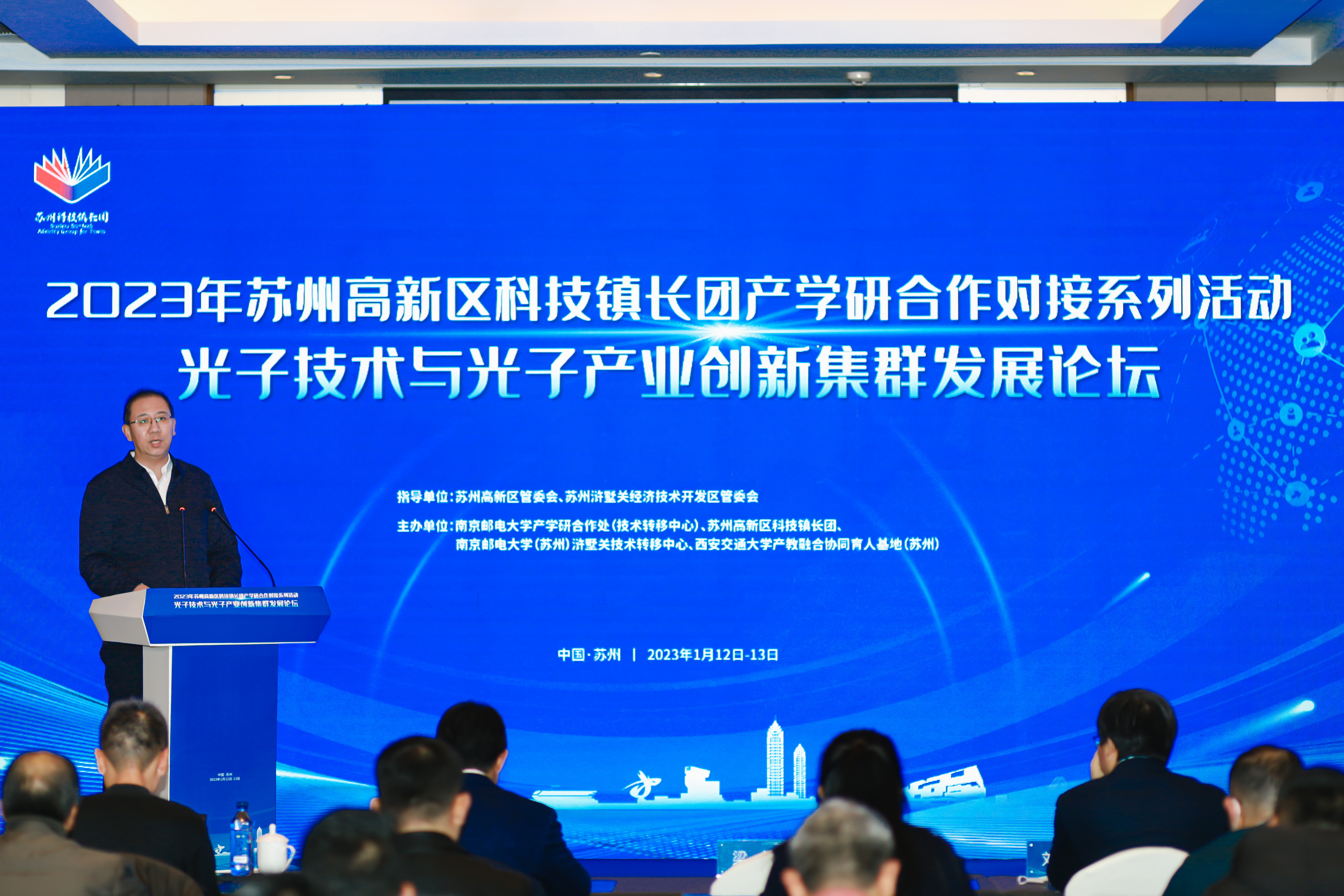 为了全面贯彻落实党的二十大精神,加快实施创新驱动发展战略,结合南京邮电大学光子技术学科优势与高新区光子产业基础和集聚创新资源优势,抢占新一轮产业发展制高点,进一步提升苏州高新区光子产业发展水平,增强产业核心竞争力,加快形成具有国内竞争力的光子产业创新集群,1月12日,南京邮电大学产学研合作处(技术转移中心)、苏州高新区科技镇长团、南京邮电大学(苏州)浒墅关技术转移中心、西安交通大学产教融合协同育人基地(苏州)联合主办的2023年苏州高新区科技镇长团产学研合作对接系列活动—光子技术与光子产业创新集群发展论坛圆满成功。
