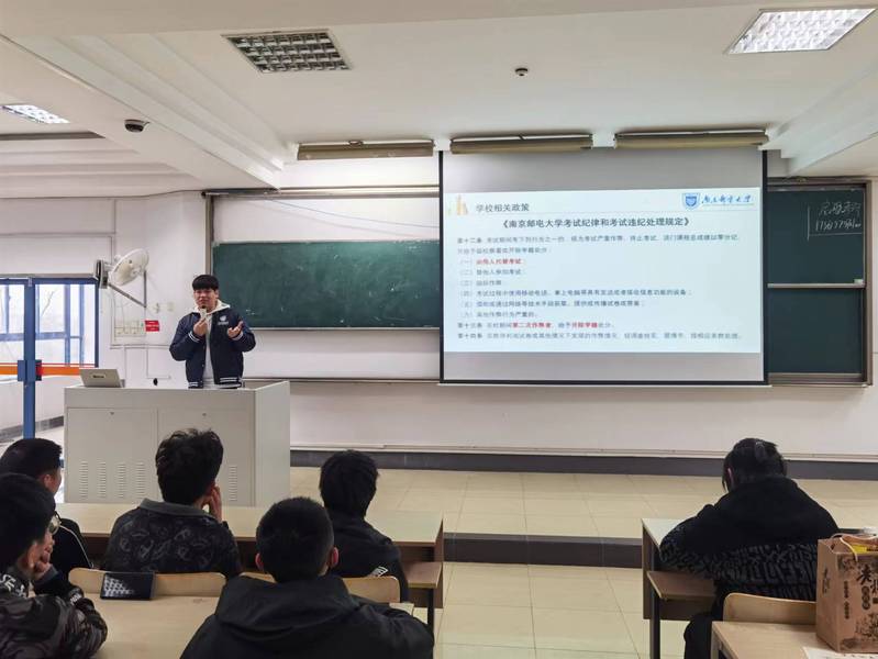 会议伊始,赵昱莼老师带领同学们学习了《南京邮电大学违纪处分规定》,提出了严肃考风考纪的要求。同时再次明确了学校对于考生违反考试规定的处罚细则。通过列举四个案例,赵老师向同学们强调,考试作弊将严重危害同学们的学业生涯,会产生不可挽回的后果。他倡导同学们恪守规定,将“诚信”二字深深烙印在脑海中,通过考前认真复习来取得期望的结果。