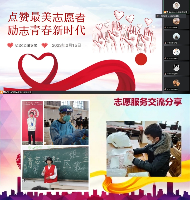 B200208班团支部以座谈的形式,由乔振、刘铖、张靓颖三位同学分享了自己的志愿服务经历,志愿活动包括社区服务、校园防疫工作、公益传播官、云支教志愿者等,三位同学的经验分享体现了我平台 团员的志愿服务精神,同时也带动大家积极参与到志愿服务中。