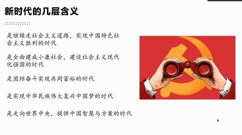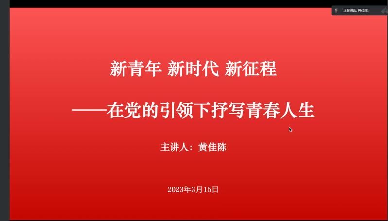 会议开始,黄佳陈老师以什么是新青年引入本期话题—“新青年新时代新征程——在党的引领下抒写青春”。并介绍了中国青年探索的历史,详细说明维新运动、新文化运动和十月革命等历史事件的重要意义,以陈延年同志为代表,介绍了历史上的优秀青年事迹,鼓励同学们积极进取抒写新时代的美好画卷。随后,讲述中国青年在救亡图存之际的组织化历程。紧接着,又为同学们介绍新时代的含义,指出时代的改变往往伴随着生产力和生产关系的重大调整。最后,黄佳陈老师以“少年中国说”结束了本次授课。