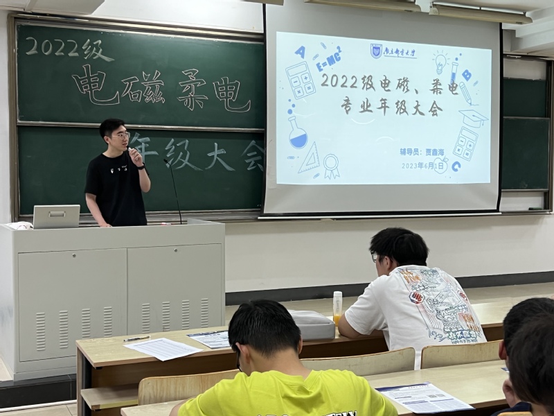 6月1日,太阳城网络赌博平台 2022级电磁场与无线技术专业、柔性电子学专业在教2-201召开“慎终如始,未来可期”主题年级大会,会议由辅导员贾鑫海老师主持,2022级电磁场与无线技术专业、柔性电子学专业全体同学参会。