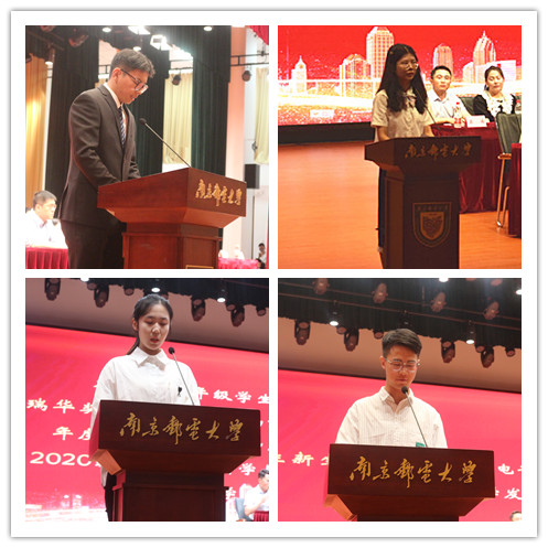 研究生高年级学生代表、院研究生会主席郭龙飞同学和本科生高年级学生代表,瑞华奖学金获得者、南京邮电大学年度人物、校国旗护卫队队长屈新月同学分别代表研、本老生对新同学的到来表示欢迎,并祝福新同学们在青春的赛道上跑出傲人成绩!研究生新生代表黄瑞玉同学和本科生新生代表马兴宇同学也在发言中表示,在往后的求学岁月里,将始终铭记刚踏入校园时的那份初心,努力成为“厚德、弘毅、求是、笃行”的南邮人。