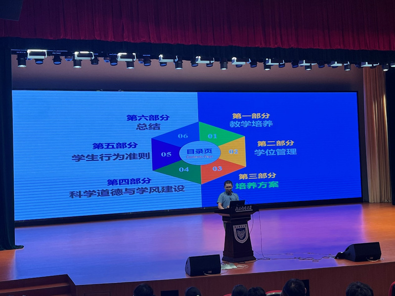 会上,陈建飞教授首先为全体2023级硕博研究生开展了研究生培养入学教育。陈建飞教授从教学培养、学位管理、培养方案、科学道德与学风建设、学生行为准则等五方面向同学们详细地介绍了学院对于研究生培养的要求和期待。他要求全体研究生热爱祖国,遵纪守法,培养严谨的治学态度、恪守学术道德和职业规范、培养良好的心理素质,勉励同学们要加强主观能动性,培养对专业的热爱,聚焦研究方向,勤奋不懈努力学习,不断提升科学研究能力和学术交流能力,熟练掌握一门外国语,早日成长为栋梁之才。