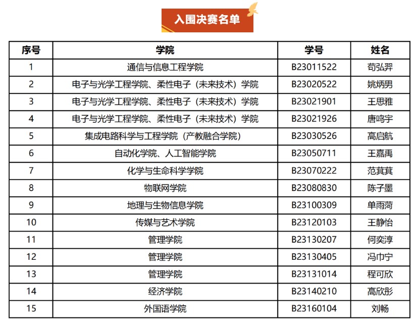 2023级新生军训期间,演讲比赛初赛100%覆盖全体新生,各学院新生经过激烈角逐,共有来自19个学院的57位同学脱颖而出,成功进入复赛。比赛现场我平台 6位选手自信满满、从容大方,他们用坚定的信念诉说了自己对家乡的赞美与期待。经过各位选手的精彩展示和评委打分,我平台 学子姚炳男、王思雅、唐鸣宇入围决赛,将再次角逐;鲍亭谕、张朝精、常宇浩拟授三等奖。