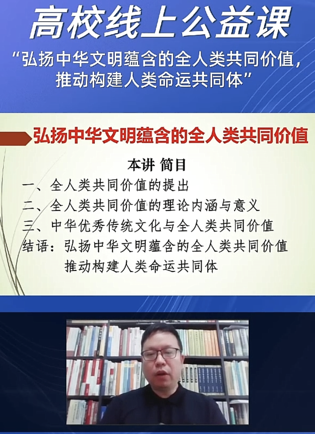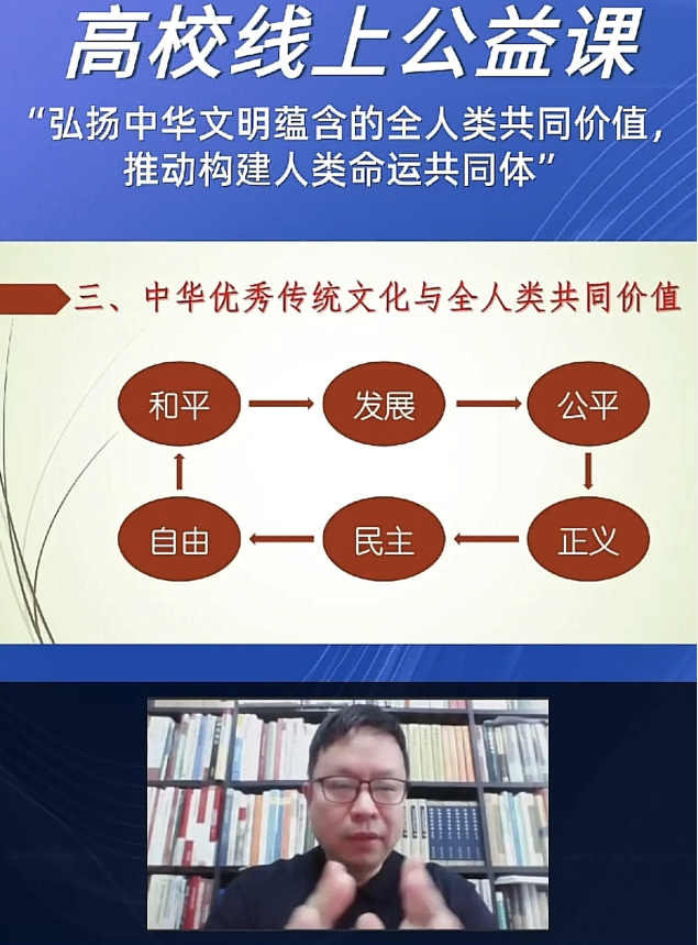 为帮助同学们学习了解人类命运共同体的时代意义及深刻内涵,领悟认同中华文化对全人类的共同价值。近日,南京邮电大学第169期菁英人才班第二次授课通过高校线上公益课的方式举行,课程主题为——弘扬中华文明中蕴含的全人类共同价值,推动构建人类命运共同体,由中央社会主义学院中华文化教研部副主任翁贺凯教授主讲。