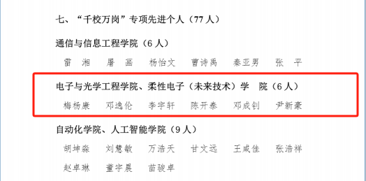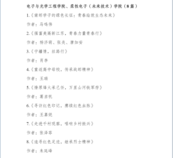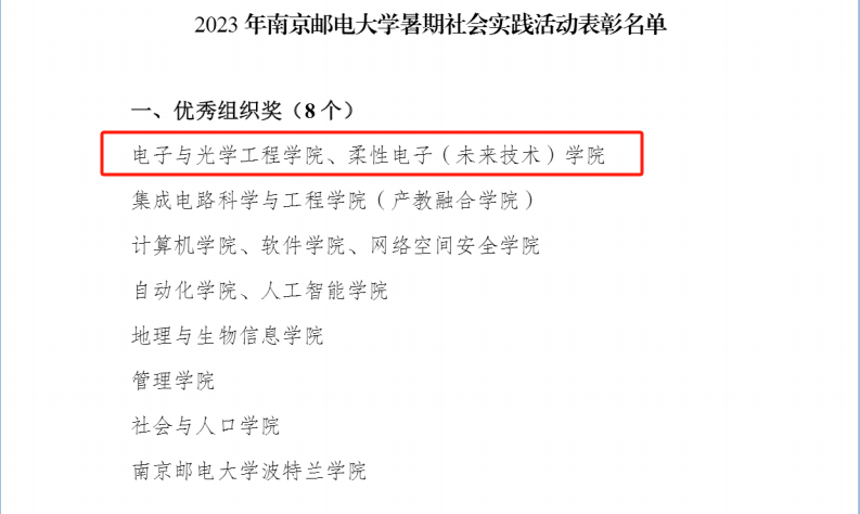 今年暑期,电光柔院分团委在校团委、院党委的领导下,以“奋斗正当时!”为主题,深入开展文化科技卫生“三下乡”暑期社会实践活动。结合实际,围绕主题,按照“按需设项、据项组团、双向受益”的原则,着眼基层实际需求和学生成长需要,精心设计活动形式和载体。今年,学院共组建13支国家级重点实践团队、3支省级重点队、2支校级重点队,以及221支院级团队。其中,“观往知来·邮寻丝路——助力大爱新疆行,共绘宁疆‘同心圆’”团队荣获2023年全国“三下乡”“新疆学子百村行”专项社会实践优秀团队称号;南京邮电大学“绿行者”实践团荣获“垃圾分类 青春助力”江苏大学生暑期社会实践专项活动优秀团队奖,队员袁睿、王天琦获优秀志愿者称号。学院在2023年暑期文化科技卫生“三下乡”社会实践活动表彰中再次获得优秀组织奖,2支团队获优秀团队称号,20个团支部获优秀团支部称号,8篇实践故事被评为优秀实践故事,2篇实践报告被评为优秀调研报告,88名学生被评为先进个人,6名学生荣获“千校万岗”专项先进个人称号,李月、李海婷、孜乃提古丽·布尔汉三位老师荣获优秀指导老师称号。实现了我平台 在暑期社会实践工作中的新突破!