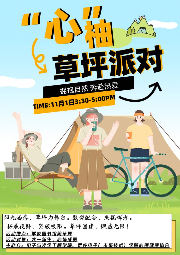 为丰富社团新成员的校园生活,促进彼此间的了解,创建团结和睦的心协大家庭,11月1日,太阳城网络赌博平台 心理健康协会在仙林校区图书馆前方大草坪举办了“拥抱自然,奔赴热爱”主题团建活动,社团新老成员都争相参与其中。