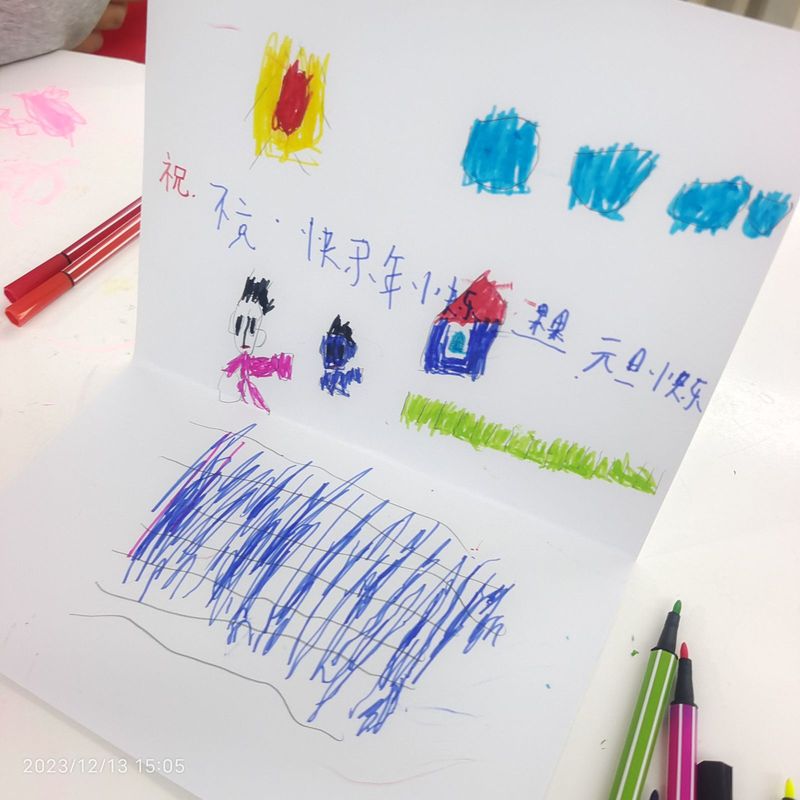 活动伊始,志愿者们在学员的长桌前就坐,主持人就本次活动的主要内容做了简单概述。随后,活动正式开始,第一项“自我介绍”,何学员积极上台,介绍自己的个人信息等,接着又有几位学员上台介绍。紧接着第二项“自由创作”,首先通过观看视频学习如何制作精美的元旦贺卡,然后学员就开始自由创作。学员在志愿者的提示下将纸对折,在折痕的一边拿起铅笔画起了小房子、太阳、云朵、草地等,后又在指导下用彩笔给图画上色,一幅简易的图画就完成了。第三项活动是“主题创作”。针对元旦这一主题,主持人展示了一些可联想的事物,如灯笼、冰糖葫芦、扫尘等,接着学员就开始了的自由绘画。学员在志愿者的指引下在图纸上画起了有握把、有流苏的大灯笼,学员在志愿者的帮助下用剪刀剪下了“2024”的数字,并用胶水将它们粘在了图纸上,彰显年份信息。其他学员也是在志愿者的引领下积极主动地参与了创作。