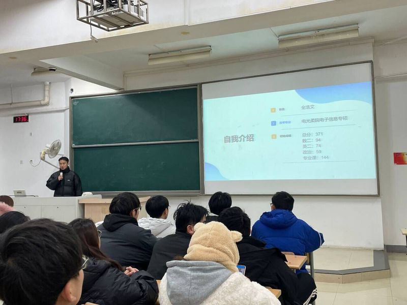 此次大会邀请了全浩文学长进行考研经验分享。全浩文学长笔试总分371分,其中专业课成绩高达144分,成功上岸南邮电光柔院电子信息专硕。全同学从“为什么要考研”这一个问题切入主题,根据当下的社会形式、时代要求,结合历届学生的就业形势及考研情况,告诉同学们要从思想上做好准备,鼓励同学们合理规划考研目标,脚踏实地,全心备考。接下来,全学长以自身情况为例为大家详细介绍了各门课程的考研准备和复习计划。全学长强调,考研其实是一场信息战,大家不仅要从各种途径收集信息,了解自己报考的学校专业以及考试科目,更要具备辨别真假的能力,因此需要慎重进行机构、资料的选择。经验分享结束后,刘心宇老师对学长的发言作了概括总结,并希望同学们都能在心中明确自己前进的方向。