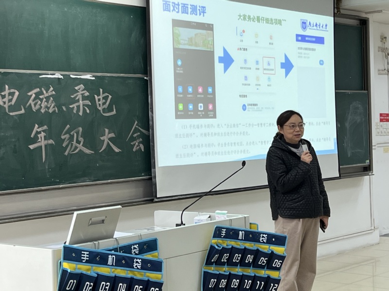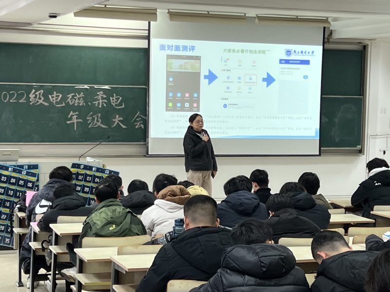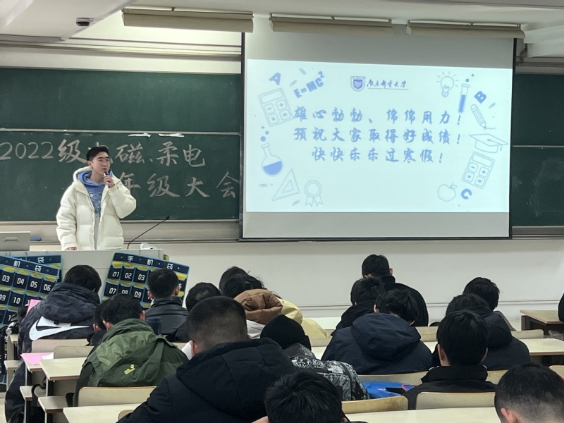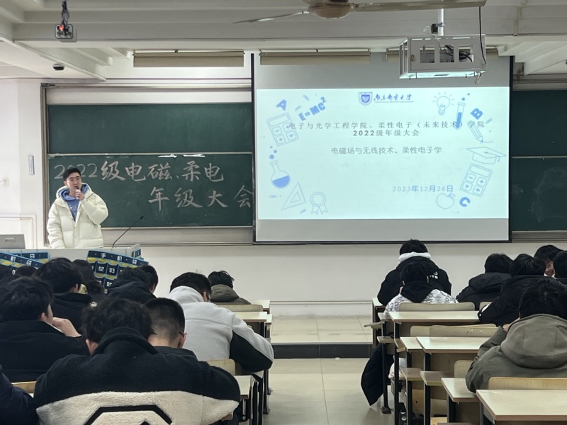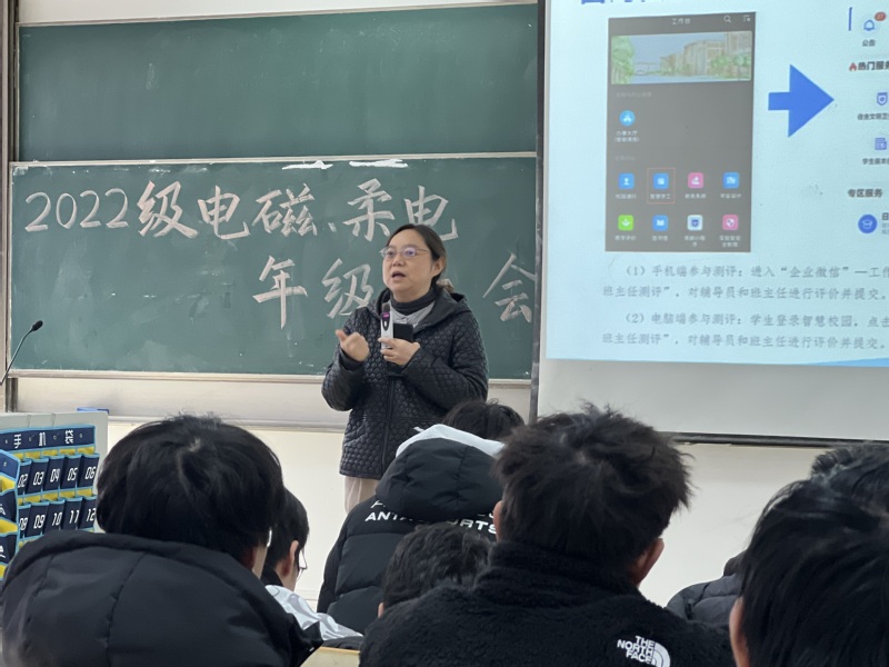 12月26日下午,太阳城网络赌博平台 2022级电磁场与无线技术专业、柔性电子学专业在教2-401教室举行“反复淬火,百炼成钢”主题年级大会,学院党委副书记、副院长徐磊老师出席本次大会,辅导员贾鑫海老师主持,全体同学参会。