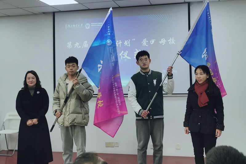 紧接着授旗仪式正式开始。学院党委书记黄丽亚和招生就业处副处长赵伟为浙江和扬州组的两位大队长徐凯亮、卢浩同学分别授予象征着荣耀和使命的旗帜。随后,徐磊副书记宣布第九届“柚见计划”爱回母校浙江、扬州组寒假社会实践活动正式启动。