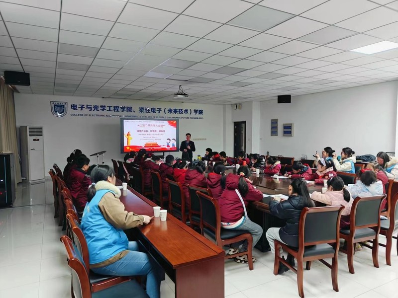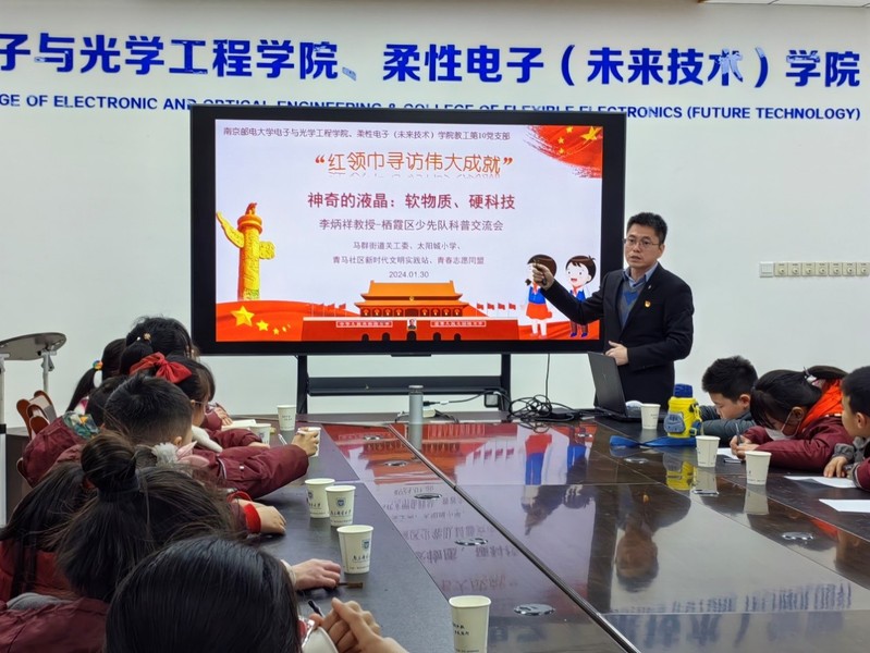 参观完实验室后,李炳祥与少先队员们开展了题为“神奇的液晶:软物质、硬科技”的科普交流会。交流会上,同学们观看了南京邮电大学80周年校庆主题宣传纪录片,了解了我校的红色历史、发展历程和瞩目成就。接着,李炳祥向同学们科普了液晶在显示与非显示领域中的科研应用,并鼓励同学们投身科研,探索液晶科学的星辰大海。李炳祥引用习近平总书记给南京大学留学归国青年学者回信中的话语勉励同学们:“以报效国家、服务人民为自觉追求,在坚持立德树人、推动科技自立自强上再创佳绩,在坚定文化自信、讲好中国故事上争做表率,为全面建设社会主义现代化国家、实现中华民族伟大复兴的中国梦积极贡献智慧和力量!”