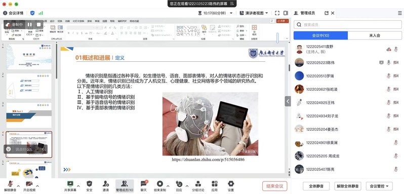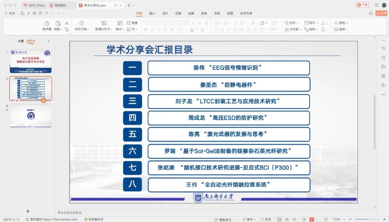 本次学术分享会由八名同学进行在线汇报,汇报主题涉及“EEG信号情绪识别”、“防静电器件”、“LTCC封装工艺与应用技术研究”等电子信息前沿热门方向。同学们在完成自己的主题汇报之后,展开积极讨论,提出各自对汇报领域的看法,整场学术分享会在浓烈的学术思想讨论与碰撞的氛围中完美进行。