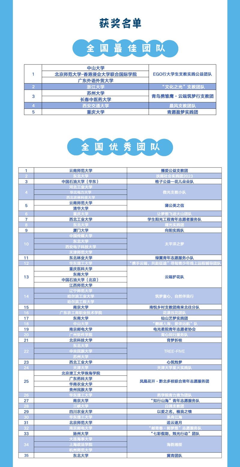 最后,向获奖的团队和同学表示祝贺,希望通过此次云支教活动更好理解志愿服务精神,并在参与中收获属于志愿服务的快乐!
