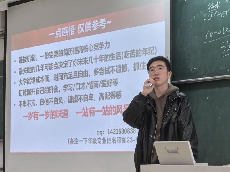 会议伊始,优秀学长汤谨溥就考研保研和职场就业两部分向同学们重点强调了“信息差”的重要性,同时结合自身的保研经历,向同学们分享了在职场以及升学中提升核心竞争力的建议和技巧,令同学们耳目一新。接着,优秀学姐朱迪迪作学术经验介绍。她从绩点、科研、竞赛、志愿活动等方面为同学们指明了前进的方向,鼓励同学们积极挑战、勇于试错,抓住每一次锻炼的机会,只要行动一切都来得及,同学们感受深切、受益匪浅。此外,B220223班学习委员孙宁也分享了自己的学习方法并对两位学长学姐的宝贵经验进行总结。