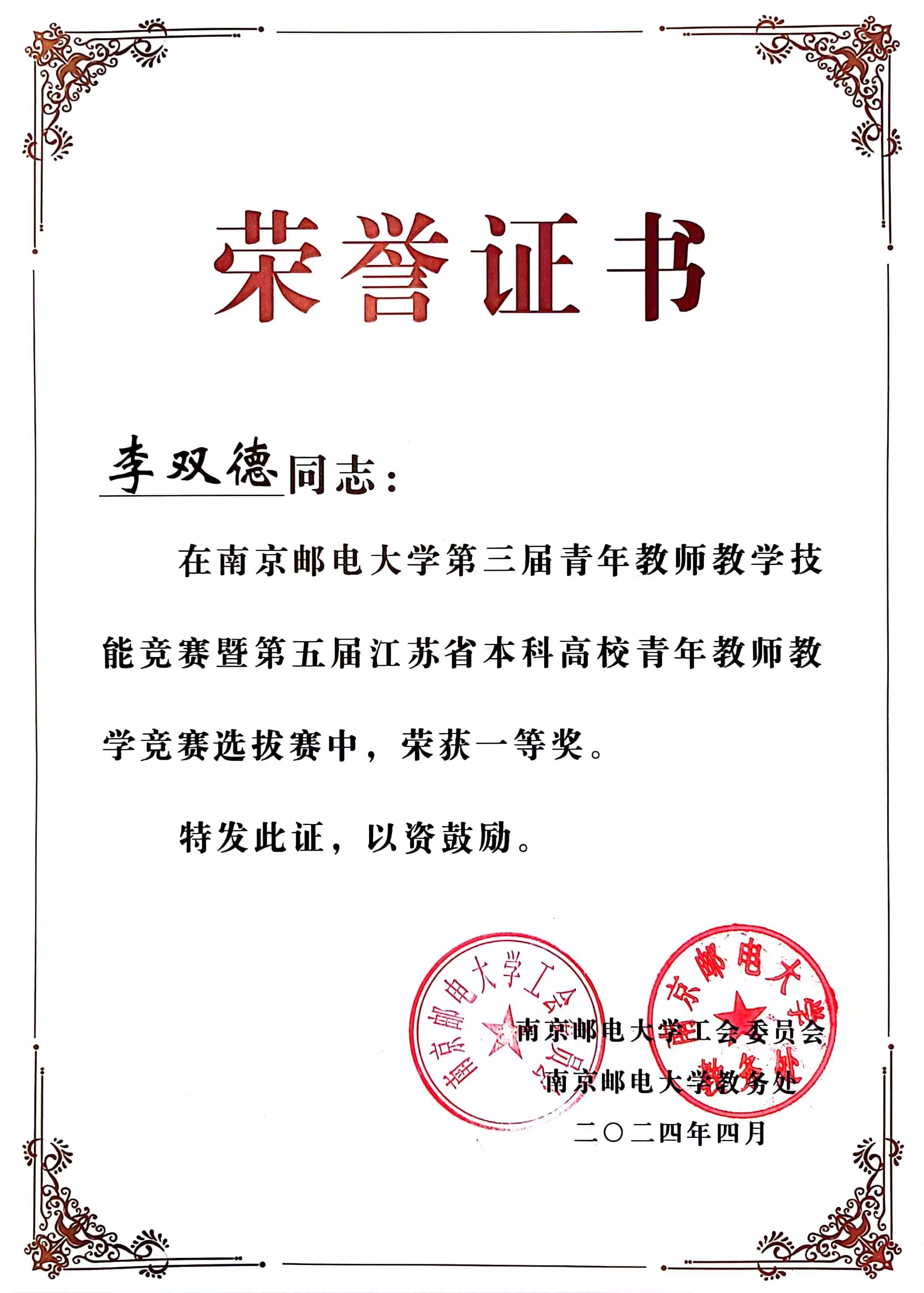 4月7日,南京邮电大学校工会会同教务处(教师教学发展中心)举办了南京邮电大学第三届青年教师教学技能竞赛暨第五届江苏省本科高校青年教师教学竞赛选拔赛。经过推荐报名、初赛、决赛层层角逐,我平台 青年教师李双德荣获一等奖,展示了我平台 本科教学水平和青年教师风采。