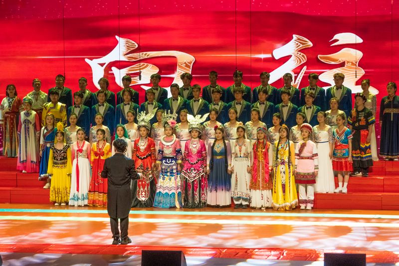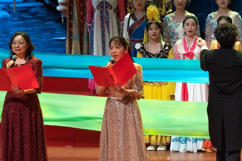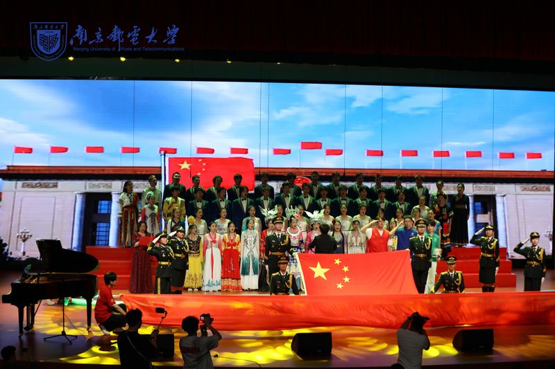 精彩的合唱表演外,还融入了多种艺术表演,使得整场演出更加多姿多彩。优雅且富有动感的舞蹈,展现出独特的韵律和美感;生动的情景剧表演,将南邮科研精神与电光柔院专业特色完美展现,展示了南邮学子科技报国梦想;舞动的“红、绿、蓝”三色彩绸更代表了南邮色彩和“战邮精神”,其宛如彩虹般飞舞,将演员围绕其中,整个场景犹如一张唯美画卷。学校国旗护卫队更像一抹亮色,为歌曲表演注入铿锵活力。整齐划一的步伐,坚定自信的眼神,无不向同学们展示出国护青年的风采和担当。歌曲尾声,黄丽亚书记、徐磊副书记、刘振老师、贾奇麟同学大气磅礴地朗诵将演出推向高潮,将对祖国的热爱和对未来的憧憬都倾注其中。