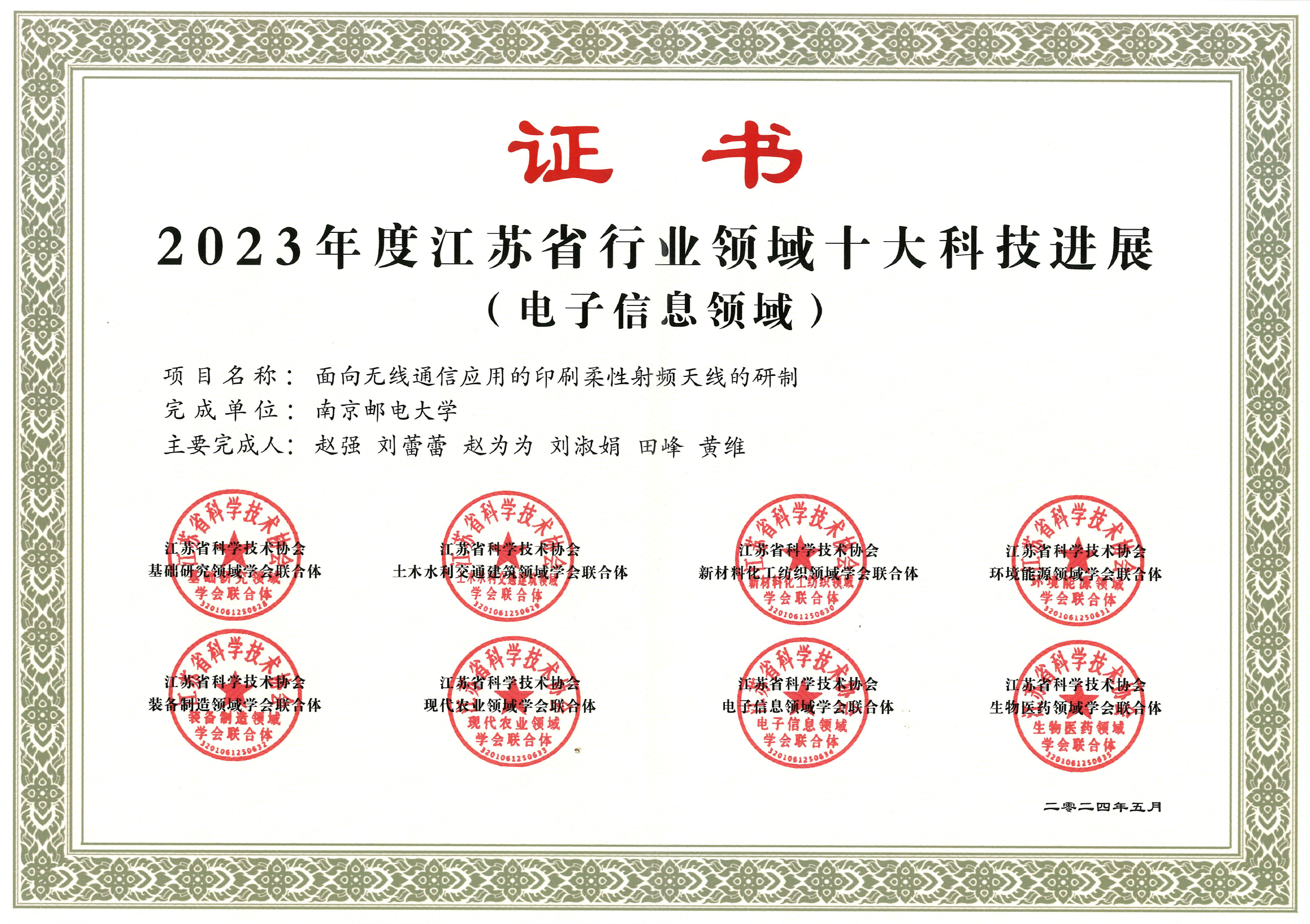 在第八个全国科技工作者日来临之际,由江苏省科学技术协会、江苏省科学技术厅主办的2024年全国科技工作者日江苏省主场活动在南京举行。会上,发布了2023年度江苏省行业领域十大科技进展。南京邮电大学有机电子与信息显示国家重点实验室黄维院士、赵强教授团队联合射频集成与微组装技术国家地方联合工程实验室刘蕾蕾教授团队、宽带无线通信与传感网技术教育部重点实验室田峰教授团队完成的“面向无线通信应用的印刷柔性射频天线的研制”成果入选“电子信息领域”十大科技进展。