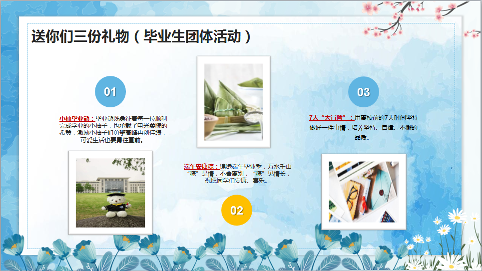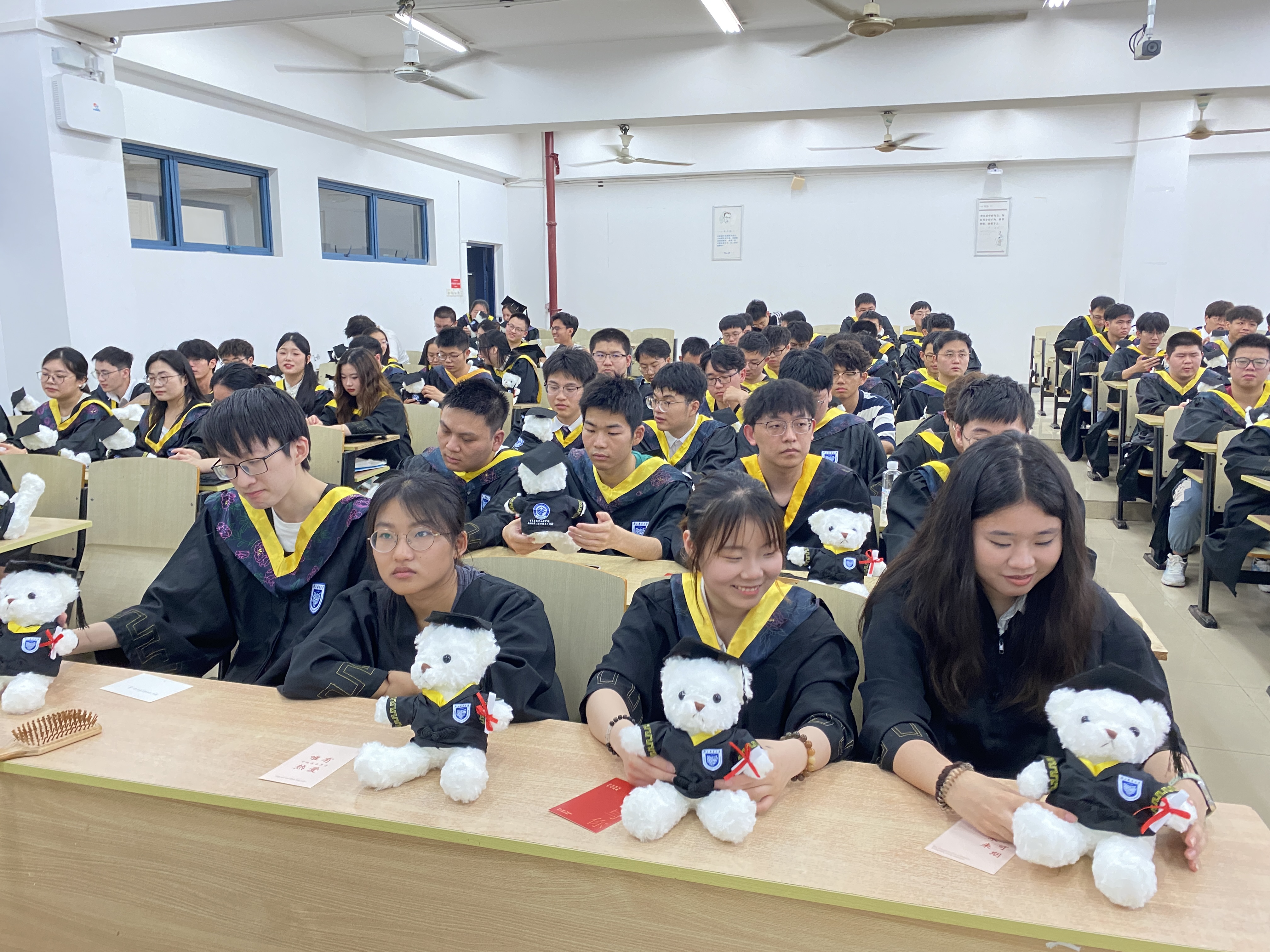 活动以“送给毕业生的三份礼物”贯穿全程。第一份礼物,小柚毕业熊。会前肖老师带领学生干部将毕业熊整齐地摆放在同学们的桌子上,毕业熊象征着每一位顺利完成学业的小柚子,也承载了电光柔院的希冀,激励小柚子们勇攀高峰再创佳绩,可爱生活也要勇往直前。