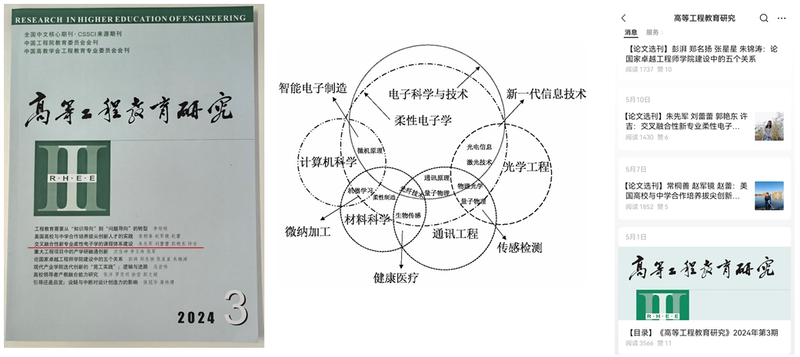 《高等工程教育研究》2024年第3期封面(左)、柔性电子学专业交叉融合学科与前沿技术对应关系(中)和《高等工程教育研究》公众号论文选刊(右)