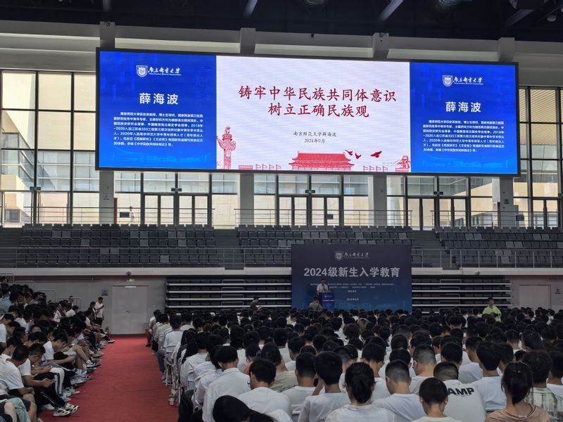 为进一步学习贯彻习近平总书记关于加强和改进民族工作的重要论述,厚植新生爱国主义情怀,铸牢中华民族共同体意识,9月8日上午,南京邮电大学通信与信息工程学院,太阳城网络赌博平台 ,计算机学院、软件学院、网络空间安全学院,自动化学院、人工智能学院,材料科学与工程学院,理学院联合举办2024级新生入学教育”系列活动。活动特邀《中华民族共同体概论》参编者之一、南京师范大学社会发展学院历史系教授、博士生导师、国家民委第三批民族研究优秀中青年专家薛海波教授为新生讲授“铸牢中华民族共同体意识树立正确民族观”开学第一课。太阳城网络赌博平台 党委副书记、副院长徐磊主持活动,各学院党委副书记、全体2024级辅导员和2024级本科生和研究生齐聚,同上一堂思政大课。
