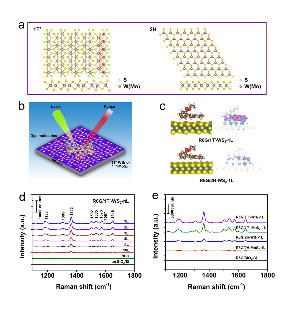 二维过渡金属二硫化物(TMDs)具有独特的物理化学性质,如良好的原子均匀性、化学稳定性和生物相容性等,其作为新一代SERS基底研究吸引了广泛的关注。但传统的半导体相TMDs由于电荷转移速率低,极大地影响其在SERS方面的应用。针对这一难题,该工作利用纳米材料相工程(PEN)技术对二维过渡金属二硫化物WS2MoS2的结晶相进行调控,制备具有高纯度扭曲八面体相的WS2MoS21T-WS21T-MoS2),并研究了半导体相(2H)与半金属相(1TSERS性能的影响。与2H-WS22H-MoS2相比较,单层的1T-WS21T-MoS2展现了更加优异的SERS性能,对分析物R6G分子的检出限分别达到8.28 ×1012M8.57 ×1011 M, 拉曼增强因子分别为4.6×1083.9×107。第一性原理密度泛函理论证明,单层的1T-WS21T-MoS2SERS效应主要归因于其与分析物之间高效的光诱导电荷转移。该工作展示的相依赖SERS特性使得通过PEN策略设计和制备新型TMDsSERS基底成为可能。